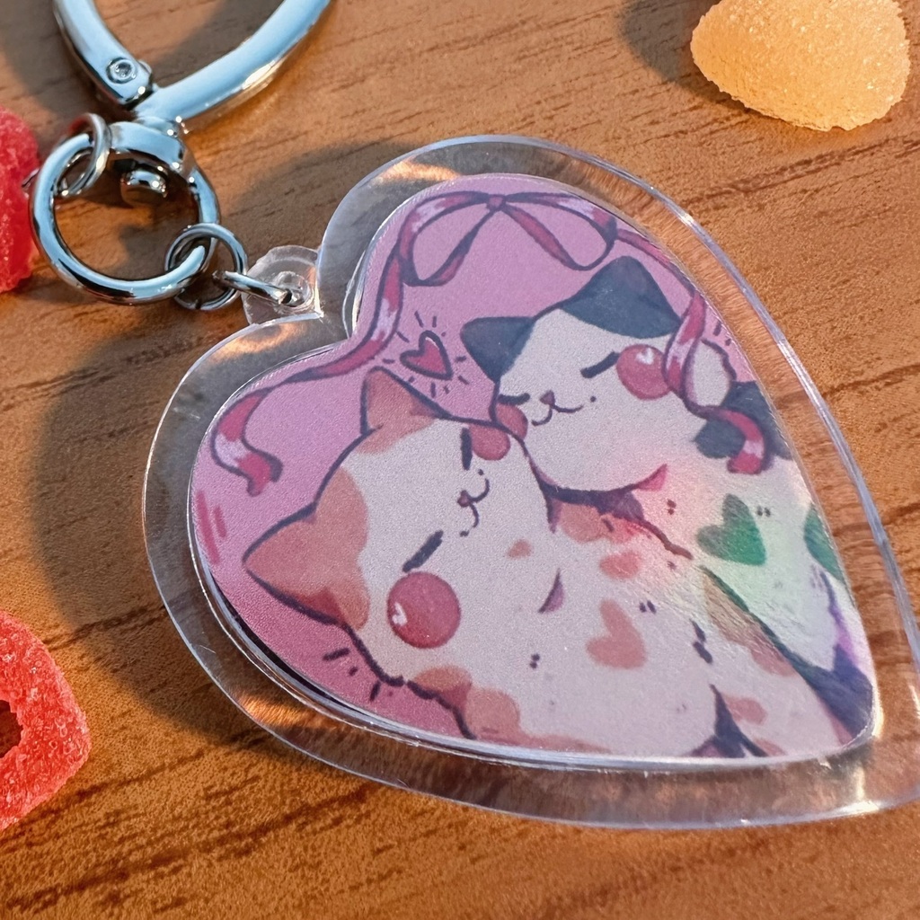 Chaveiro acrílico com mosquetão importado em formato de coração e laminação da arte levemente holográfica.